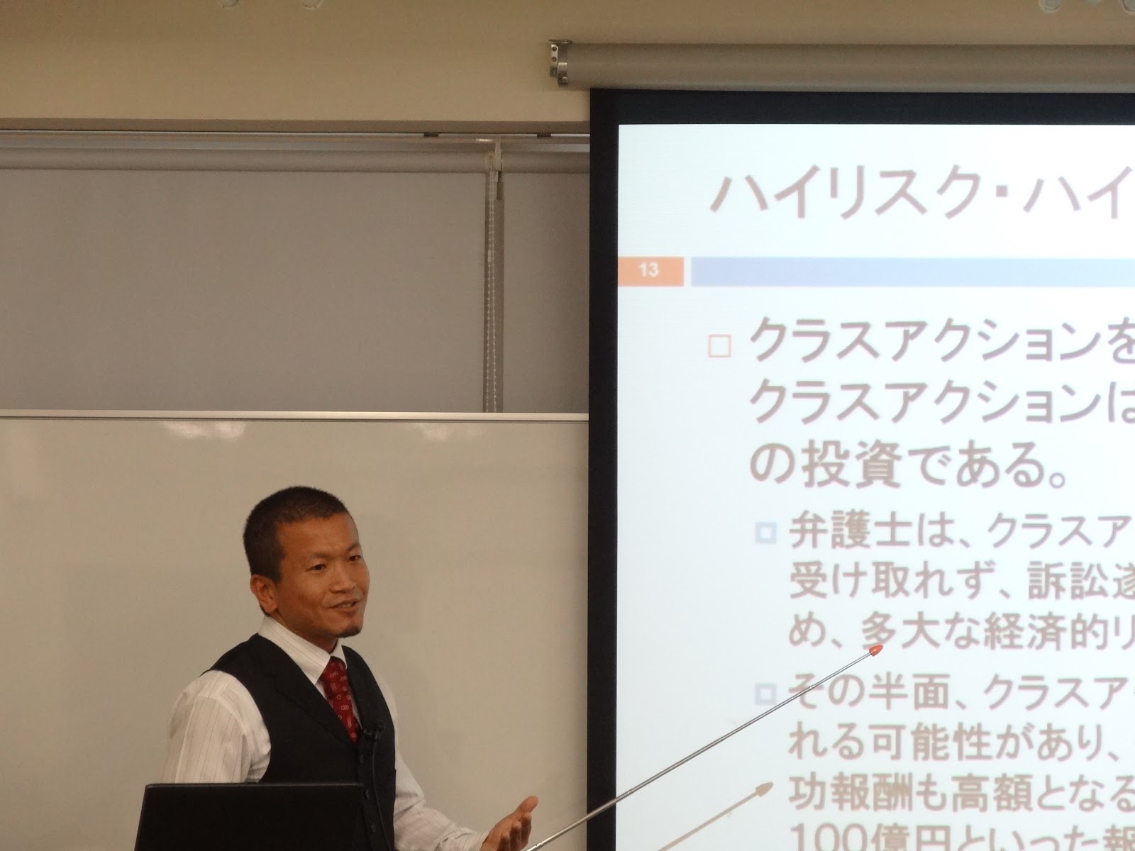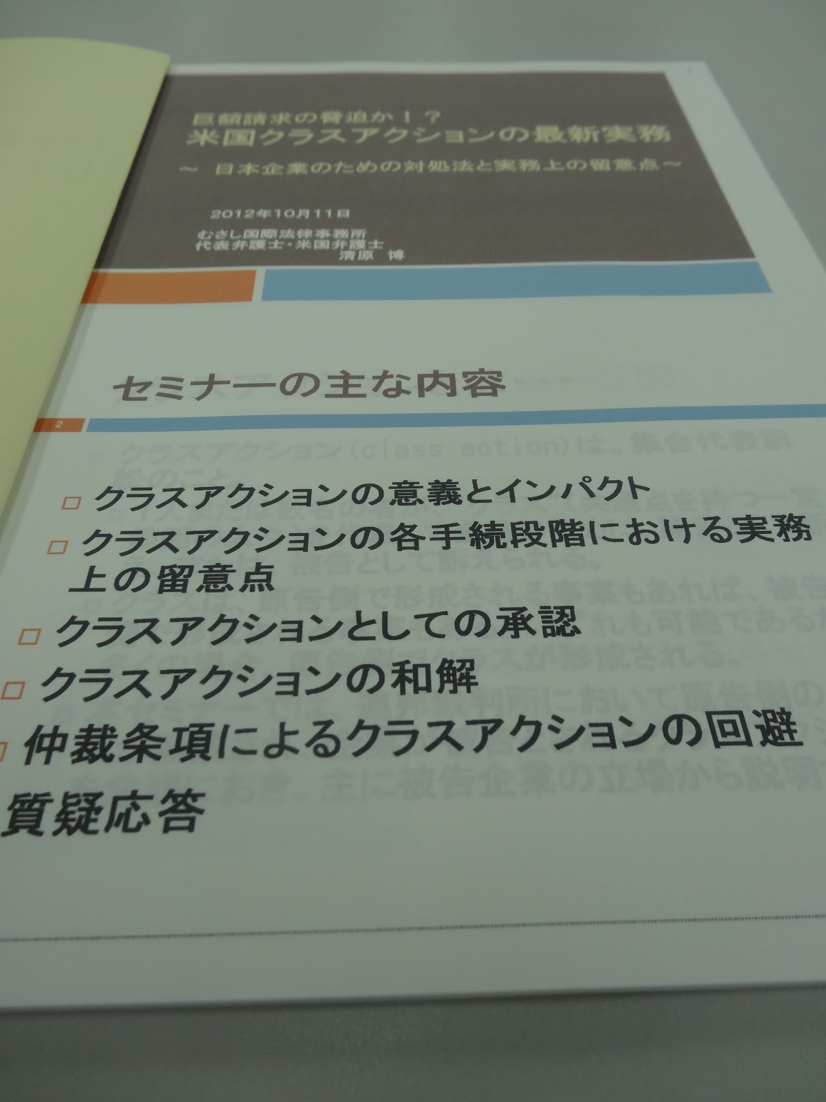 セミナーでは、クラスアクションの承認、分類、和解、仲裁条項、最近の動向についての説明がありました。